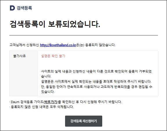하루 기다리니 다음 검색등록 결과가 이메일로 와있네요 아쉽지만, 보류가 되었습니다. 사이트 설명란에 태국에 관한 정보와 재태크 관련 이라고 적었는데, 블로그의 글이 태국에 관한 글이 하나도 없어서 보류 되었다고 하네요.