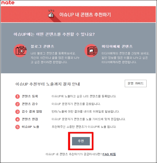 위의 네이트 이슈up 페이지에 접속하신 후에, 아래의 화면이 나오면 추천 버튼을 눌러 주세요.
