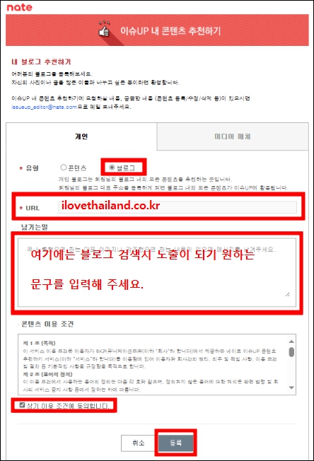 아래의 화면이 나오면, 개인, 블로그, URL, 블로그 설명란을 기입해 주시고, 이용조건을 클릭해주신 후에 등록 버튼을 눌러 주세요.