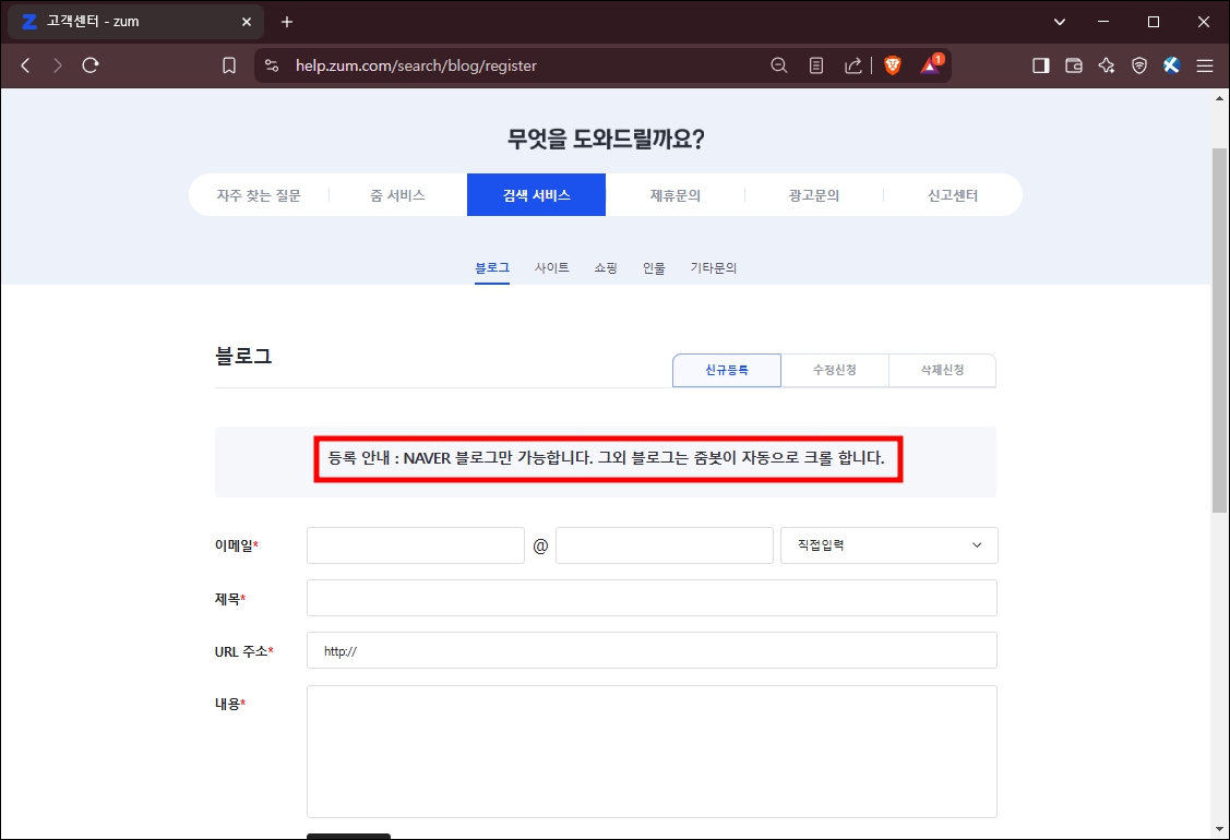 티스토리 블로그는 줌 검색엔진에 따라 사이트등록을 하실 필요가 없습니다. 아래의 화면을 보시면, 줌에는 네이버 블로그만 등록이 가능하며, 나머지 블로그 들은 줌봇이 자등으로 크롤링한다고 되어 있습니다.