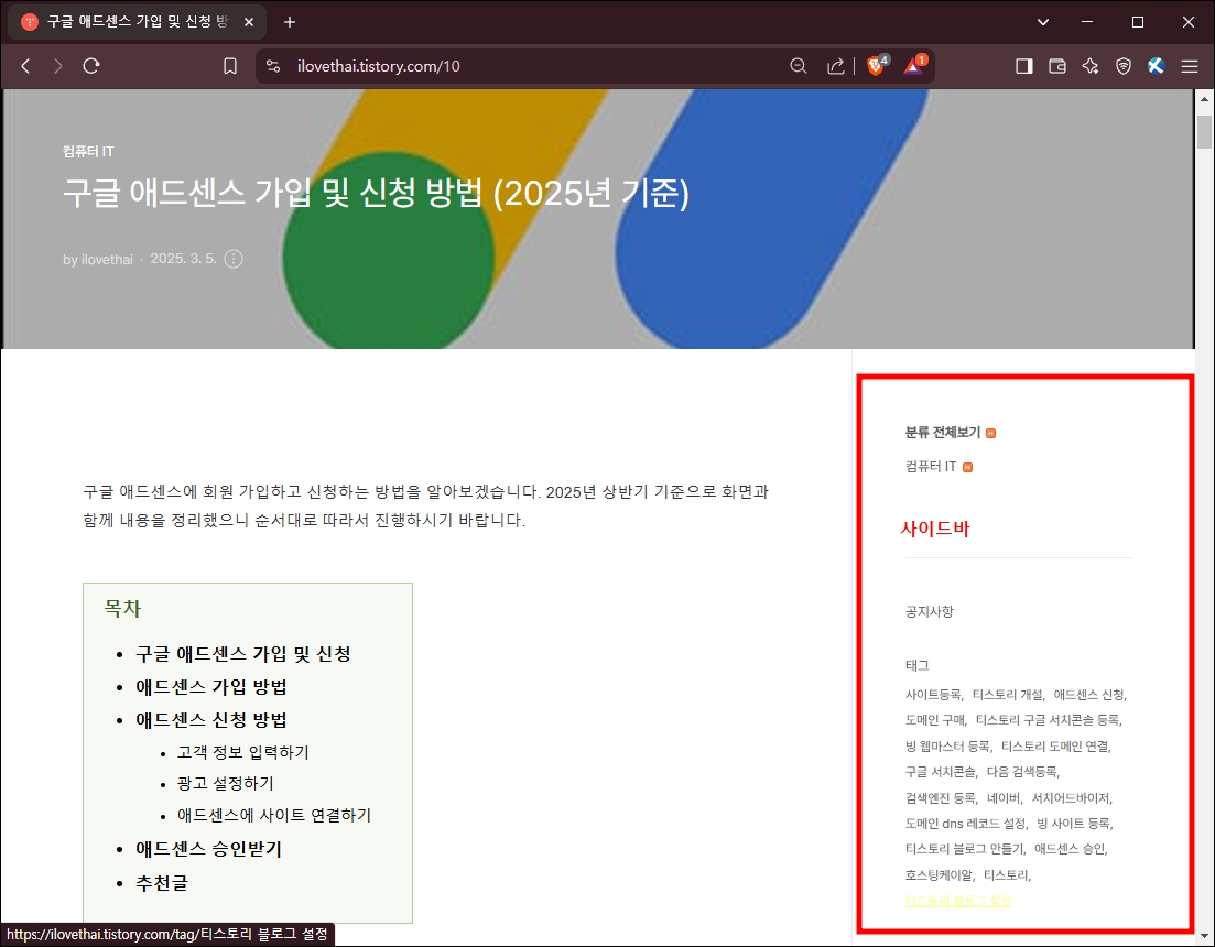 아이러브타일랜드 블로그는 오늘 애드센스를 신청하였기에, 아래의 화면에 보면 Google Adsense라고 나와있는 것을 보실 수 있는데, 나중에 애드센스 승인이 나면, 여기에 광고가 나오게 됩니다.