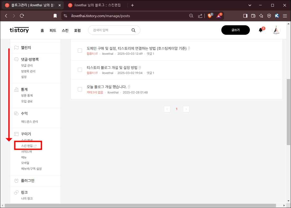 티스토리에 로그인을 하였다면, 왼편의 메뉴 중에 스킨편집을 선택해 주세요.