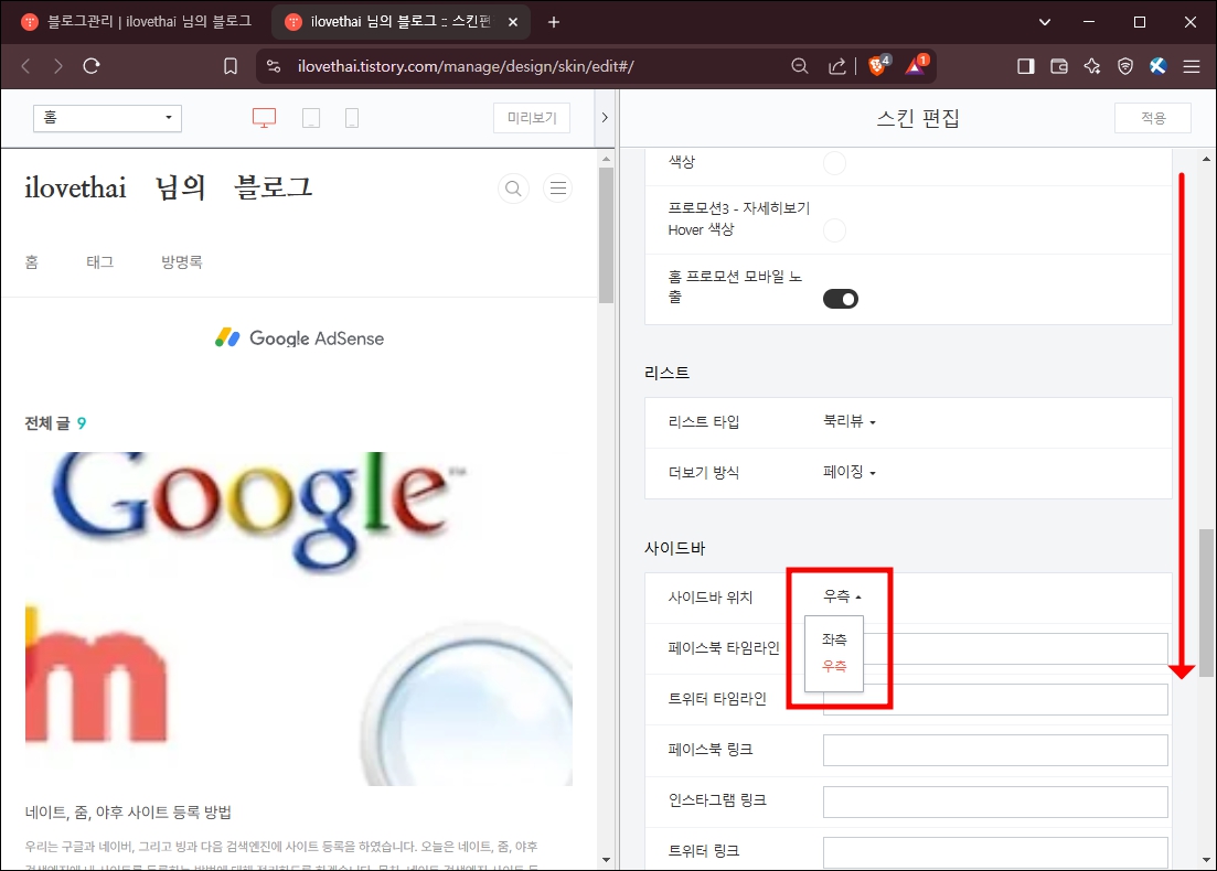 아래의 화면이 나오면, 오른쪽에 있는 메뉴를 아래로 쭉 스크롤을 해주시면, 사이드바 메뉴가 보이는데, 기본으로 우측으로 되어 있는 것을 보실 수 있습니다.