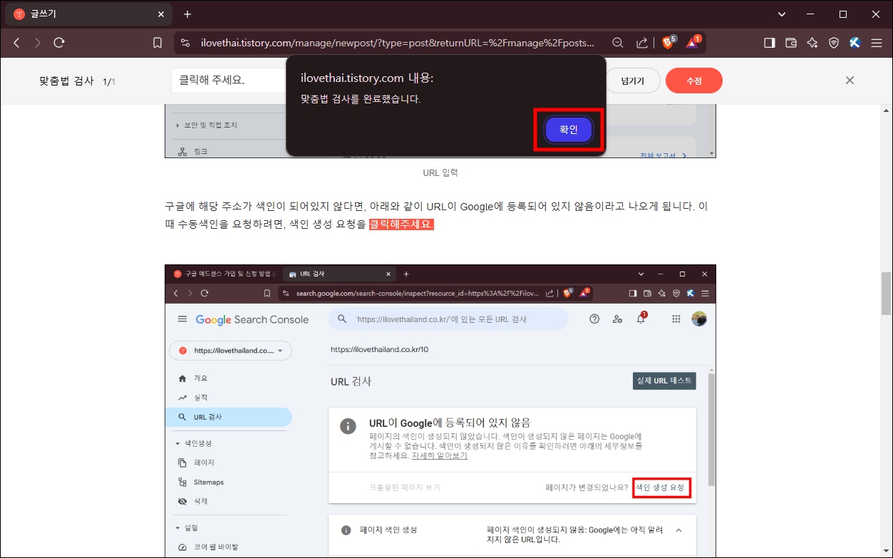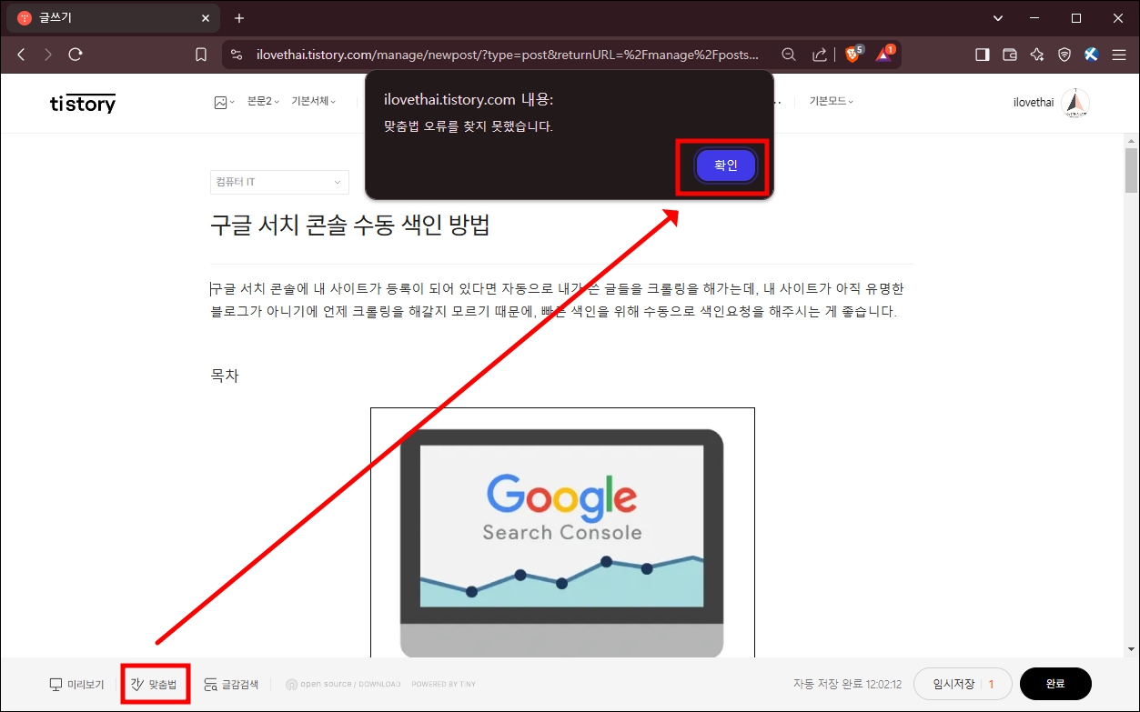 티스토리 맞춤법은 두 번 또는 세 번 정도 누를 때까지 계속 수정 사항이 나올 수 있습니다. 그러니 한 번만 하지 마시고, 위의 화면처럼, 맞춤법 오류를 찾지 못했습니다 라는 메시지가 나올 때까지 두세 번 실행해 주시는 걸 추천드립니다.