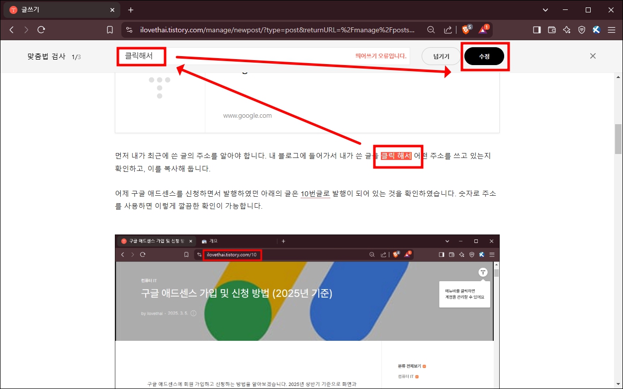 위에서 수정을 누르면, 바로 두 번째 맞춤법 수정사항을 추천합니다. 저는 클릭해서라고 글을 썼는데, 이를 붙여서 쓰는 걸 추천을 해주네요. 그대로 인정하고 수정 버튼을 눌러 줍니다. 그럼, 티스토리가 추천한 대로 띄어쓰기가 수정되고, 다음으로 진행이 됩니다.