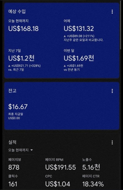 때에 따라서는 클릭당 0.03$ 정도 되기도 하는데, 이러한 때에는 아무리 클릭이 많아도 하루 10달러를 넘기 힘들게 됩니다. 그래서 우리는 어그로성 글로 방문자만 늘리기보다는 정성글로 블로그 지수를 높여야 하는 이유입니다.