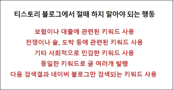 위의 이미지 중 제일 아래의 문구에 대해 추가로 설명을 하자면, 다음 검색창에서 특정 키워드를 검색했는데, 검색 결과에 티스토리는 없고 네이버 블로그만 있다면, 해당 키워드는 위험할 수 있으니 사용하지 말라는 말입니다.