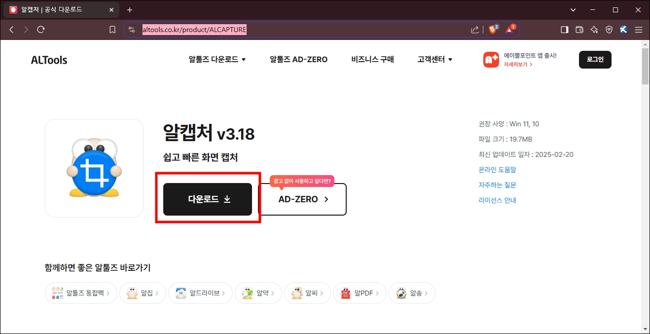 위의 링크로 알툴즈사에 방문하시면, 아래처럼 최신 버전의 알캡처 다운로드를 하실 수 있습니다. 알캡처는 다운로드뿐만 아니라 간단한 편집도 캡처와 동시에 가능하니 정말 편리한 사용이 가능합니다.