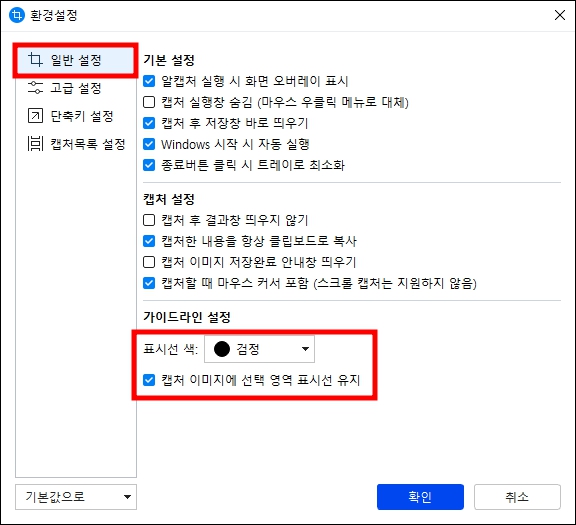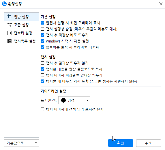 환경설정을 누르신 후에 아래와 같이 일반 설정, 고급 설정, 단축키 설정, 캡처목록 설정 등 4가지의 메뉴를 볼 수 있는데, 저의 경우에는 꼭 일반설정에서 제일 아래 메뉴는 검은색으로 적용을 해주고 있습니다.