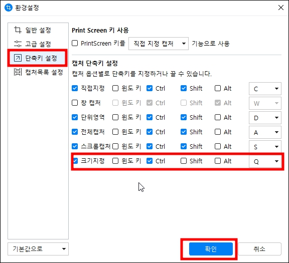 아래는 단축키 설정 화면 입니다. PrintScreen 키를 사용할지, 특정 단축키를 사용할지는, 또는 어떤 단축키를 사용할지 본인이 여러 번 해보면서 지정을 해주시기 바랍니다.
