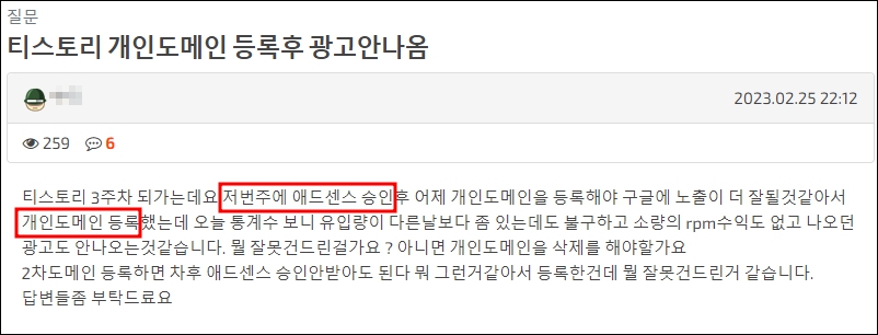 아래는 티스토리 블로그로 애드센스 승인을 완료한 이후에, 애드센스 도메인 승인이 좋다는 이야기를 듣고, 부랴부랴 도메인을 구입한 후에 승인받은 티스토리 블로그에 2차 도메인을 입힌 블린이의 질문입니다.
