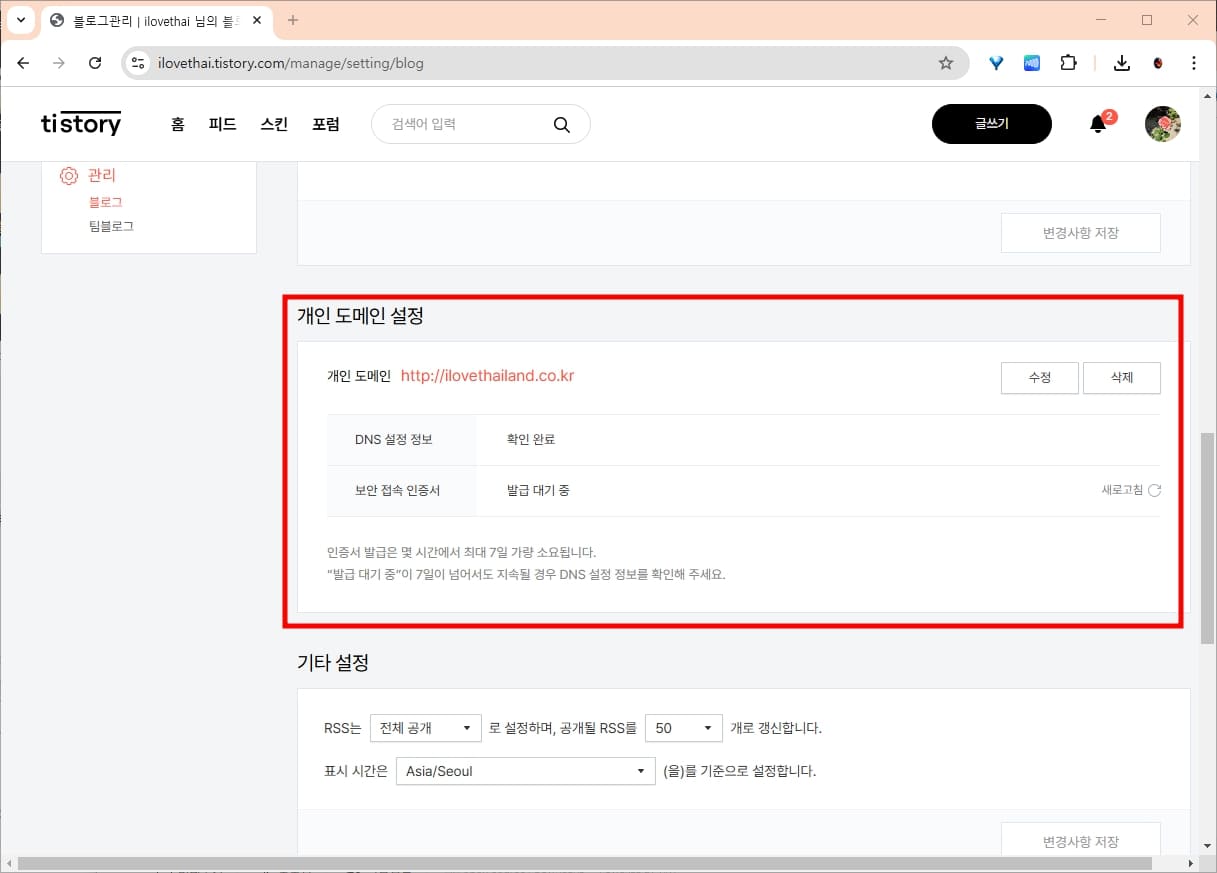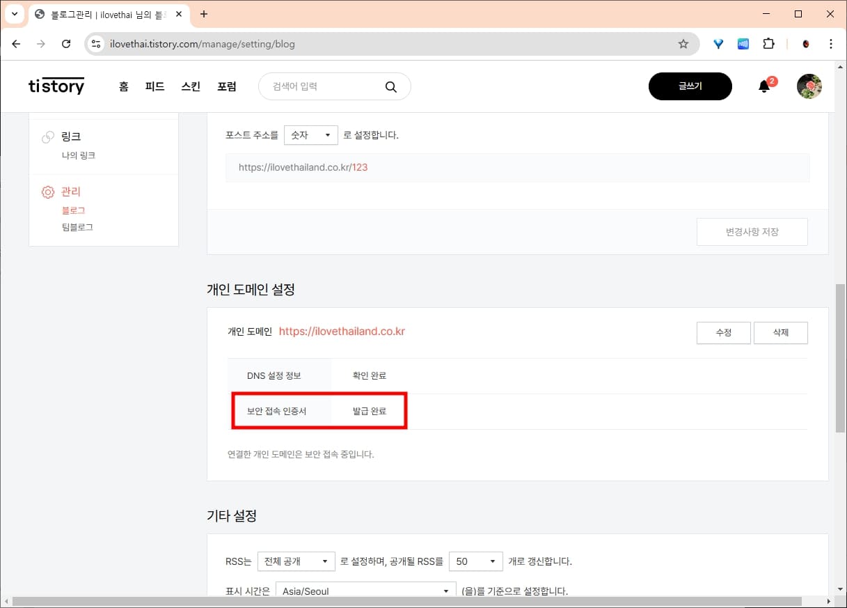 저녁에 티스토리 도메인 연결 작업을 해놓고 아침에 보니 보안 접속 인증서 발급이 완료되었습니다. 이제 티스토리에 도메인을 연결하는 작업이 모두 끝났습니다.