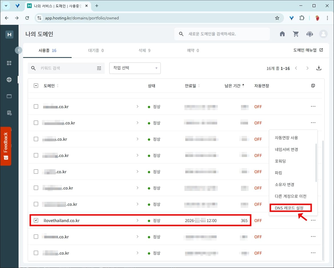 설정하고자 하는 도메인의 오른쪽에 있는 점 3개 모양의 아이콘을 선택하면 추가 메뉴가 뜹니다. DNS 레코드 설정을 눌러 주세요. 다계정을 하고 있다 보니, 나의 도메인이 16개 사용중이라고 나오네요.