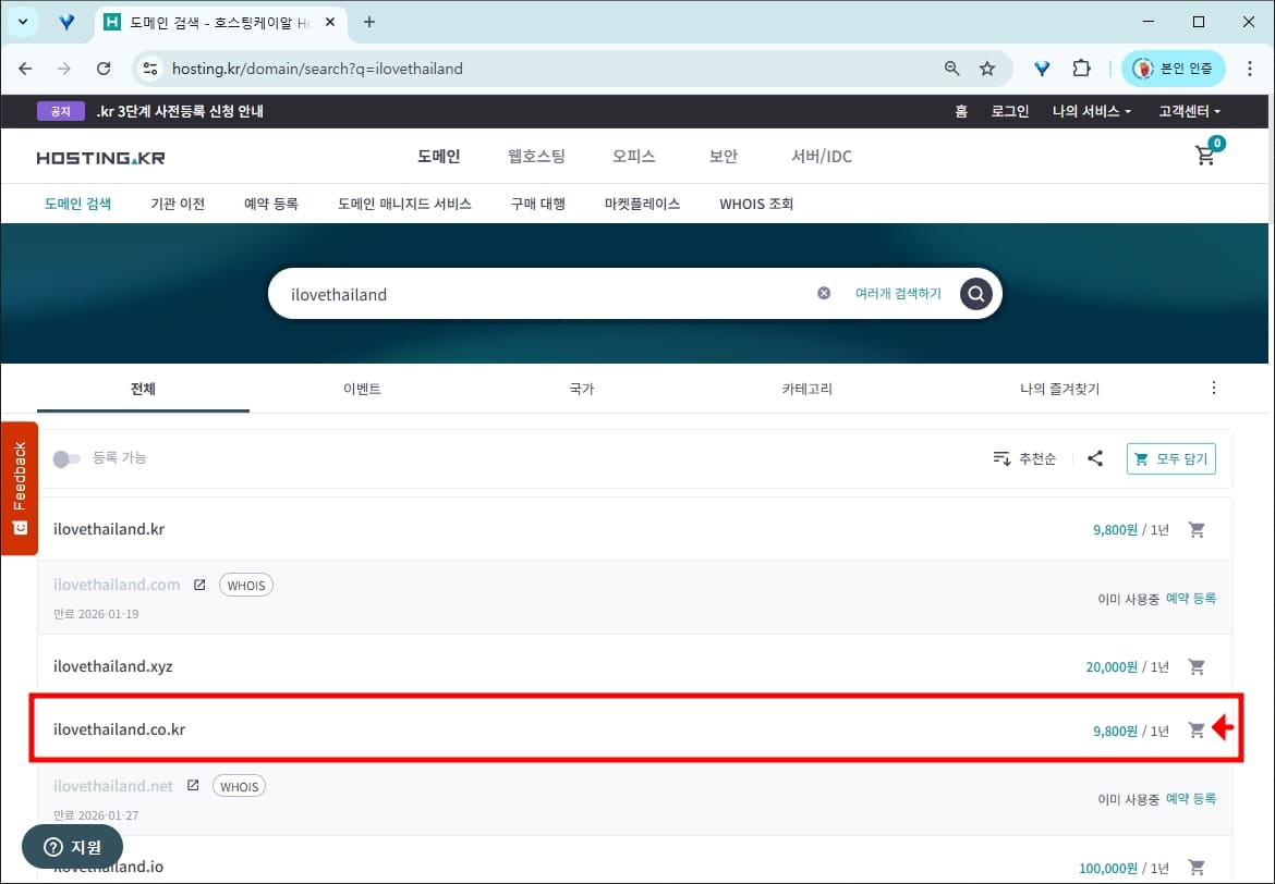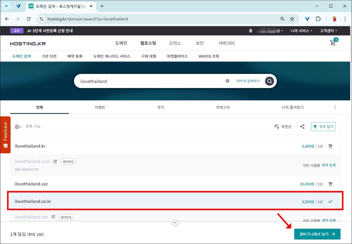 ilovethailand를 검색해 보니 '.co.kr' 주소가 있어서 장바구니에 담았습니다. '.co.kr'는 국내 도메인 주소로 해외 도메인인 '.com' 보다 등록이 좀 더 간단합니다.