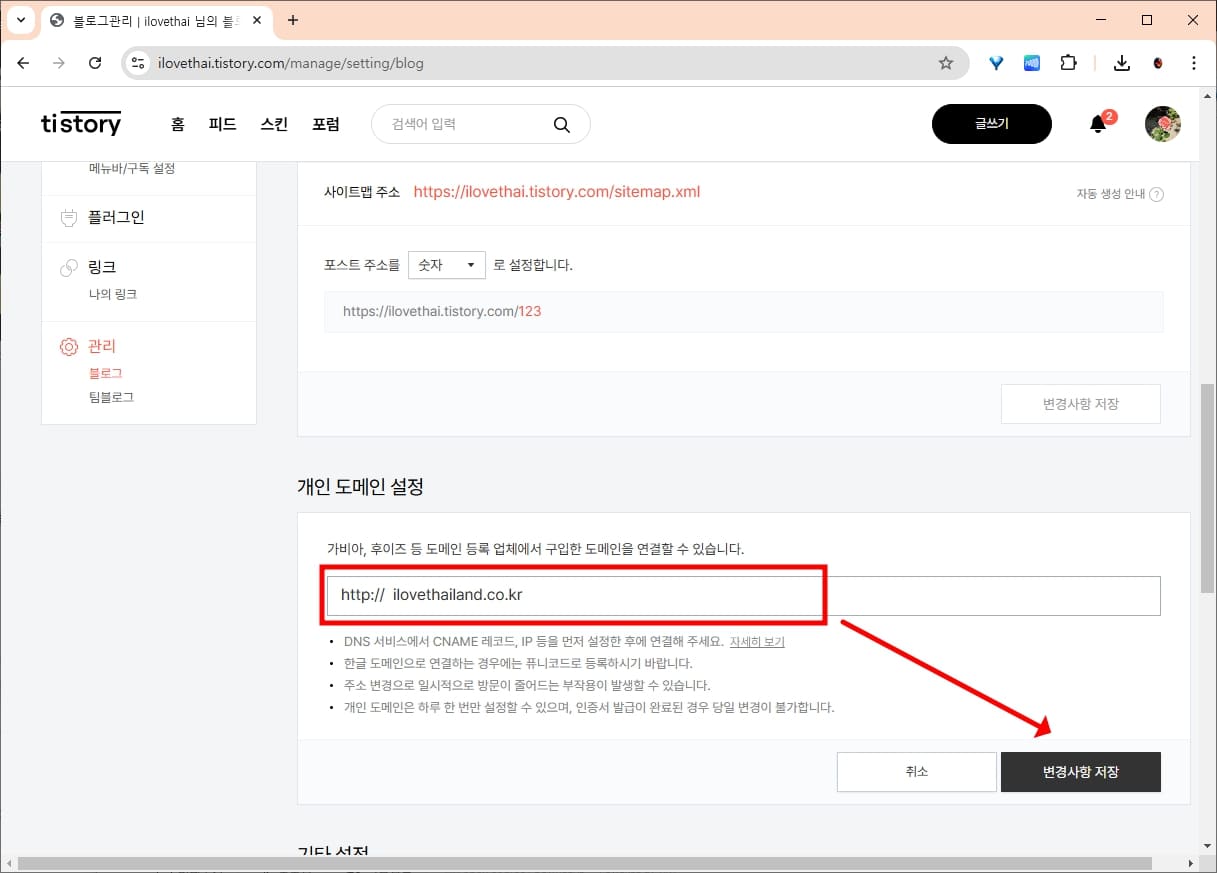 구매한 ilovethailand.co.kr 도메인 주소를 입력하고 변경사항 저장을 눌렀습니다.