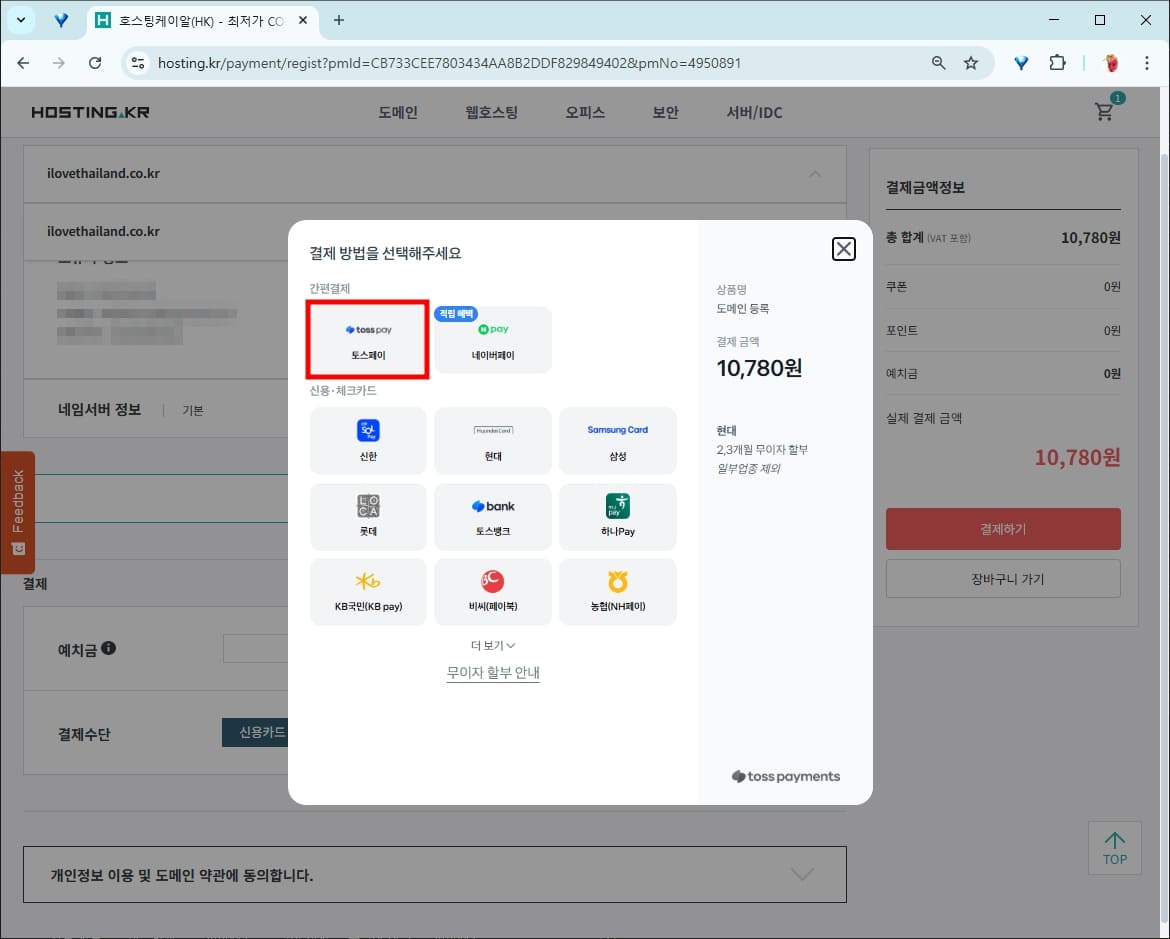 호스팅케이알에서는 간편 결제로 토스페이, 네이버페이가 지원됩니다. 신용/체크카드를 사용할 경우 해당 카드를 선택하고 결제를 진행하면 됩니다.