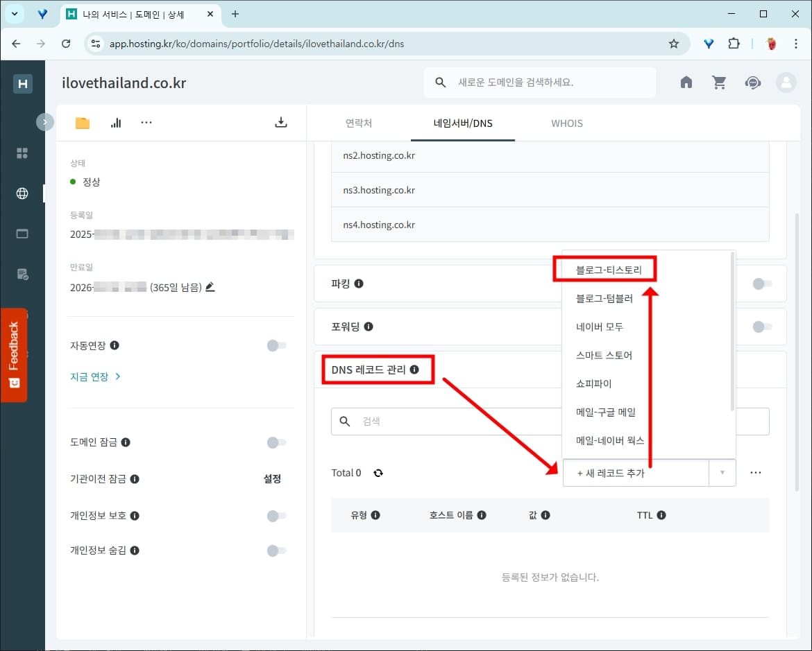 해당 도메인의 네임서버/DNS 메뉴가 뜨면 아래로 스크롤해서 DNS 레코드 관리 화면으로 갑니다. +새 레코드 추가 메뉴에는 블로그-티스토리 설정이 기본적으로 되어 있으니 바로 선택하면 됩니다.