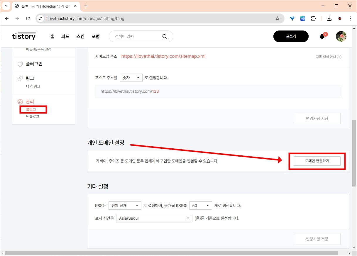 상단에는 블로그 설정이 있고 하단에는 블로그 사이트맵, 포스트 주소 설정과 함께 개인 도메인 설정이 있습니다. 개인 도메인 설정에서 도메인 연결하기를 선택합니다.