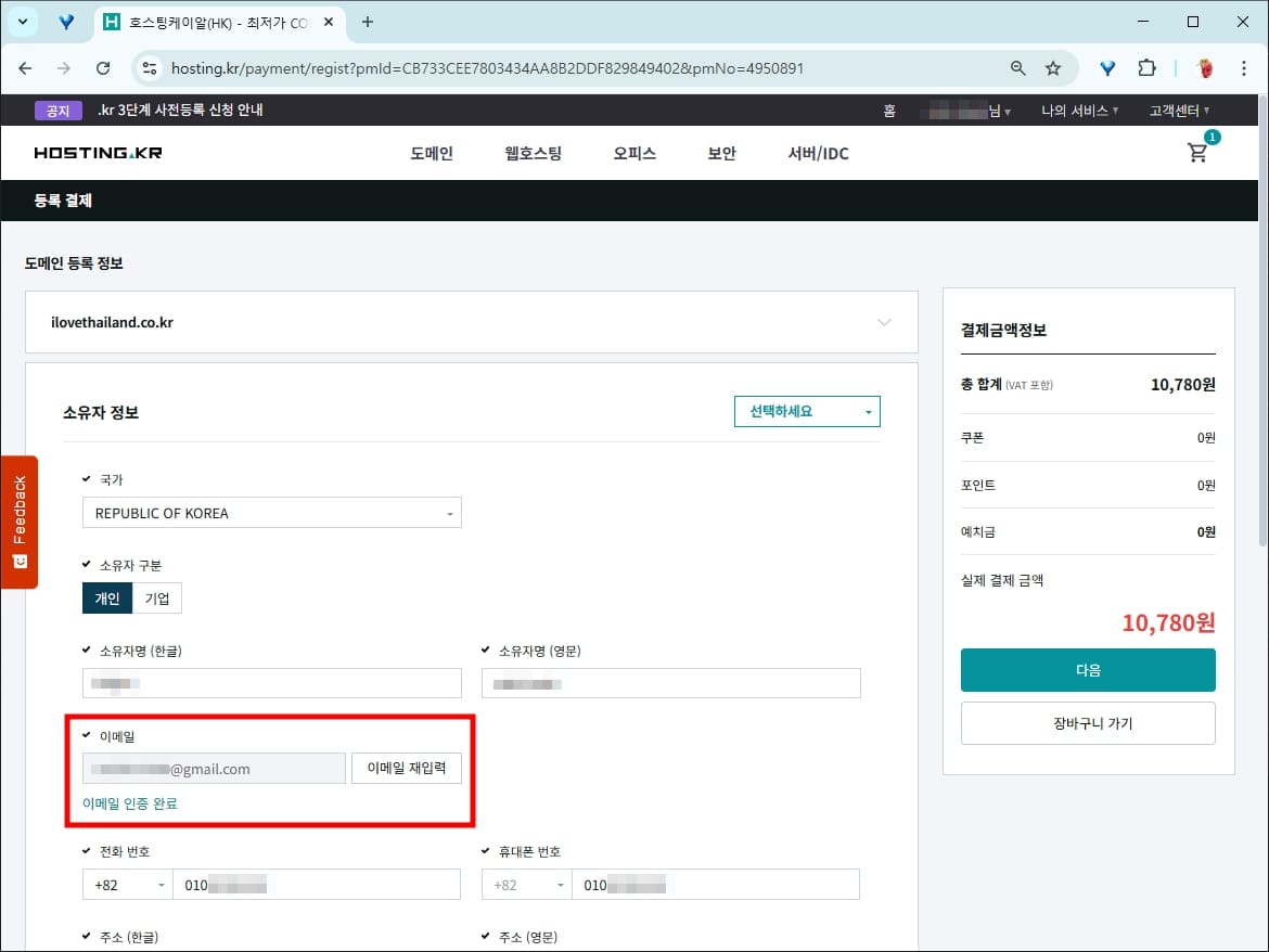 처음 도메인을 구매하는 경우에는 이메일 인증을 해야 합니다. 등록된 이메일 주소로 인증메일이 가면 확인해야 결제 단계로 넘어갑니다.