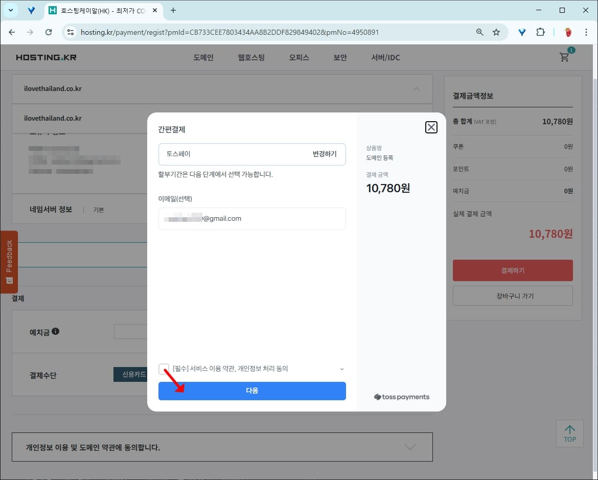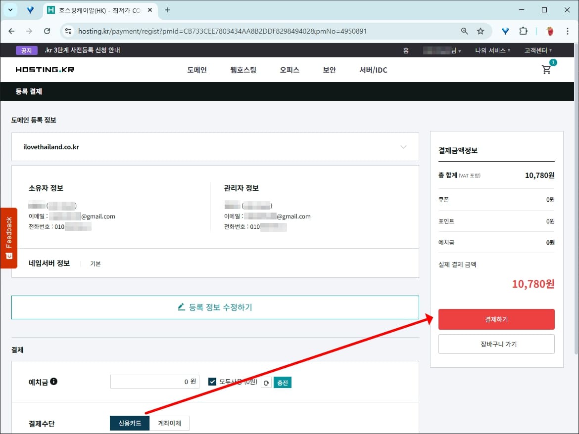 도메인 금액은 9,800원이며 부가세가 붙어서 10,780원이 결제됩니다.