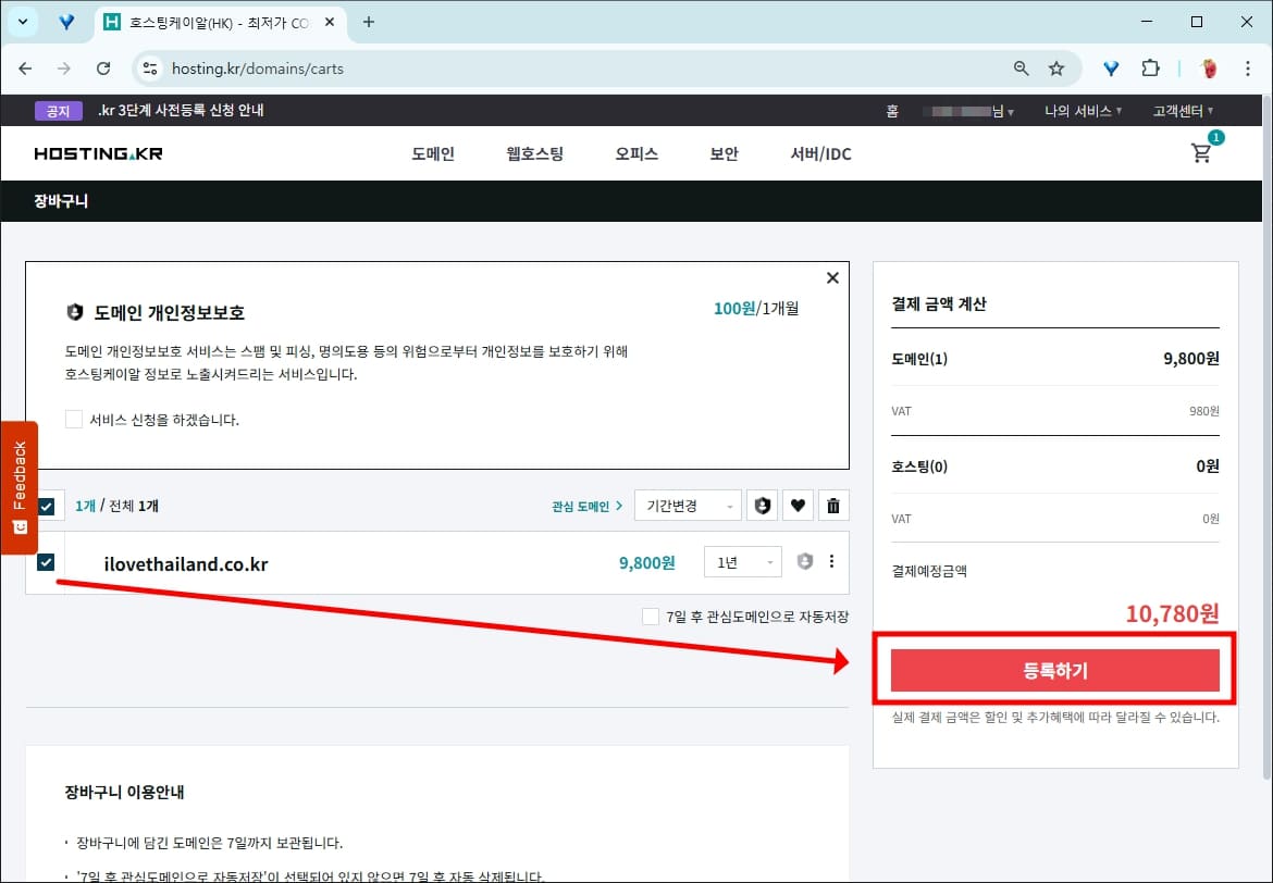 장바구니 화면이 나오면 자신이 선택한 도메인을 확인할 수 있습니다. 도메인 개인정보보호 서비스를 선택하면 매월 100원을 내면 개인정보를 보호할 수 있습니다. 이 부분은 옵션이므로 선택하지 않고 그대로 진행해도 됩니다.