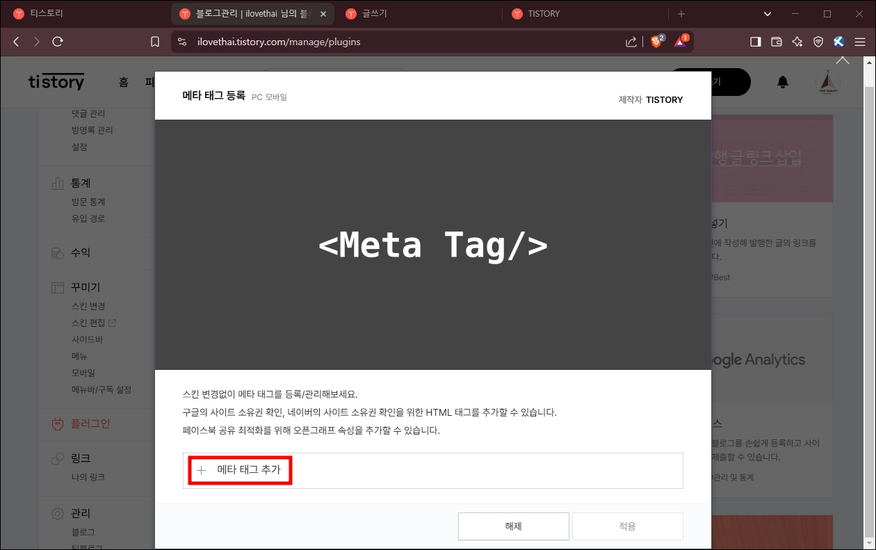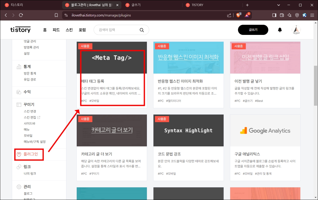 이제 티스토리 메뉴창으로 오셔서, 플러그인을 선택하신 후에, Meta Tag 플러그인을 선택해 주세요. 여기에서 네이버 서치어드바이저 소유권 인증이 가능합니다.