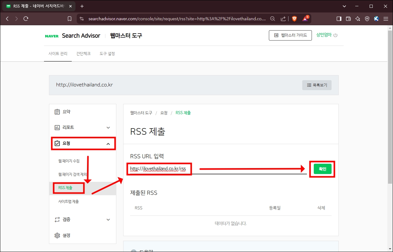 여기에서도 역시 사이트맵과 rss를 제출하여 내 사이트를 온전히 네이버 검색엔진에 각인을 시켜 주어야 합니다. 아래처럼 사이트 등록이 되어 있다면, http://ilovethailand.co.kr을 클릭해 주세요.