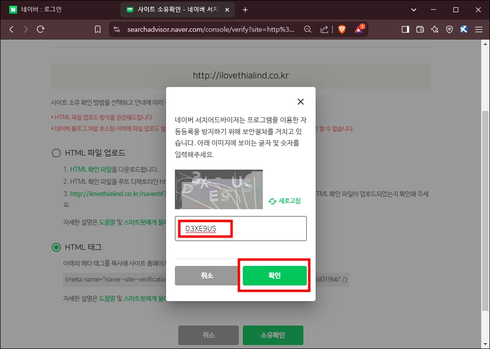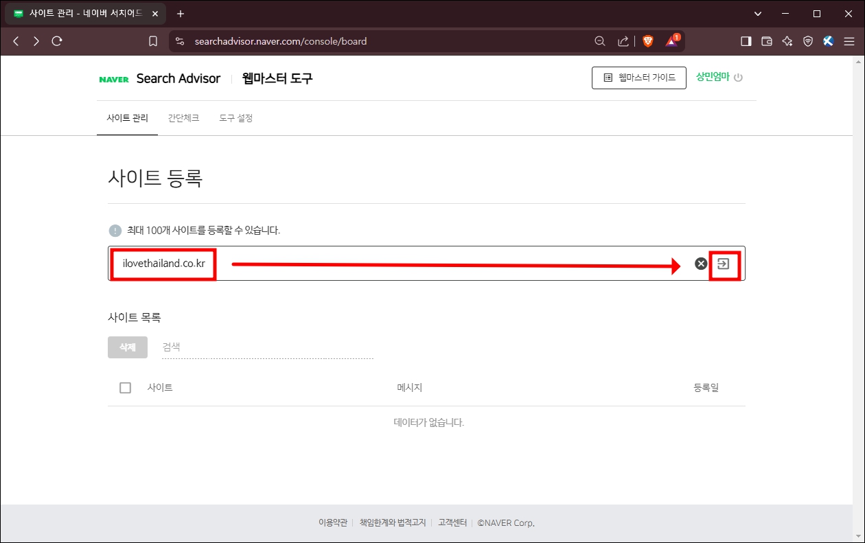 이제 우리가 가지고 있는 웹사이트인 ilovethailand.co.kr을 입력한 후, 우측 박스를 클릭해주세요. 영문 스펠링을 정확히 입력해주시고, 소문자로 입력해 주셔야 합니다.