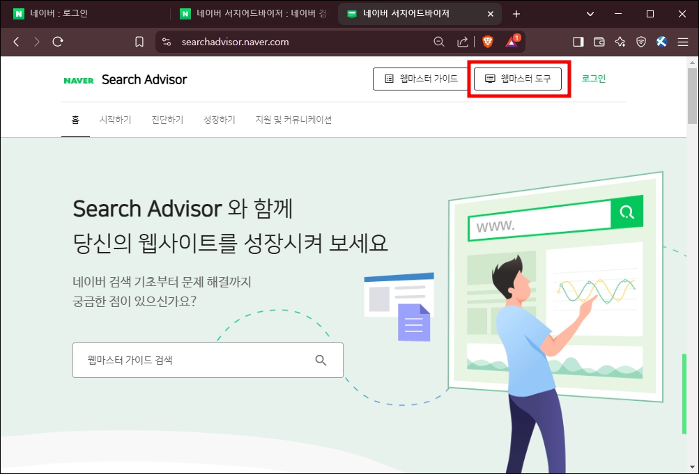 네이버 서치어드바이저 화면입니다. 여기에 처음 오셨다면, 웹마스터 가입을 위해 우측 상단의 웹마스터 도구를 선택해 주세요.