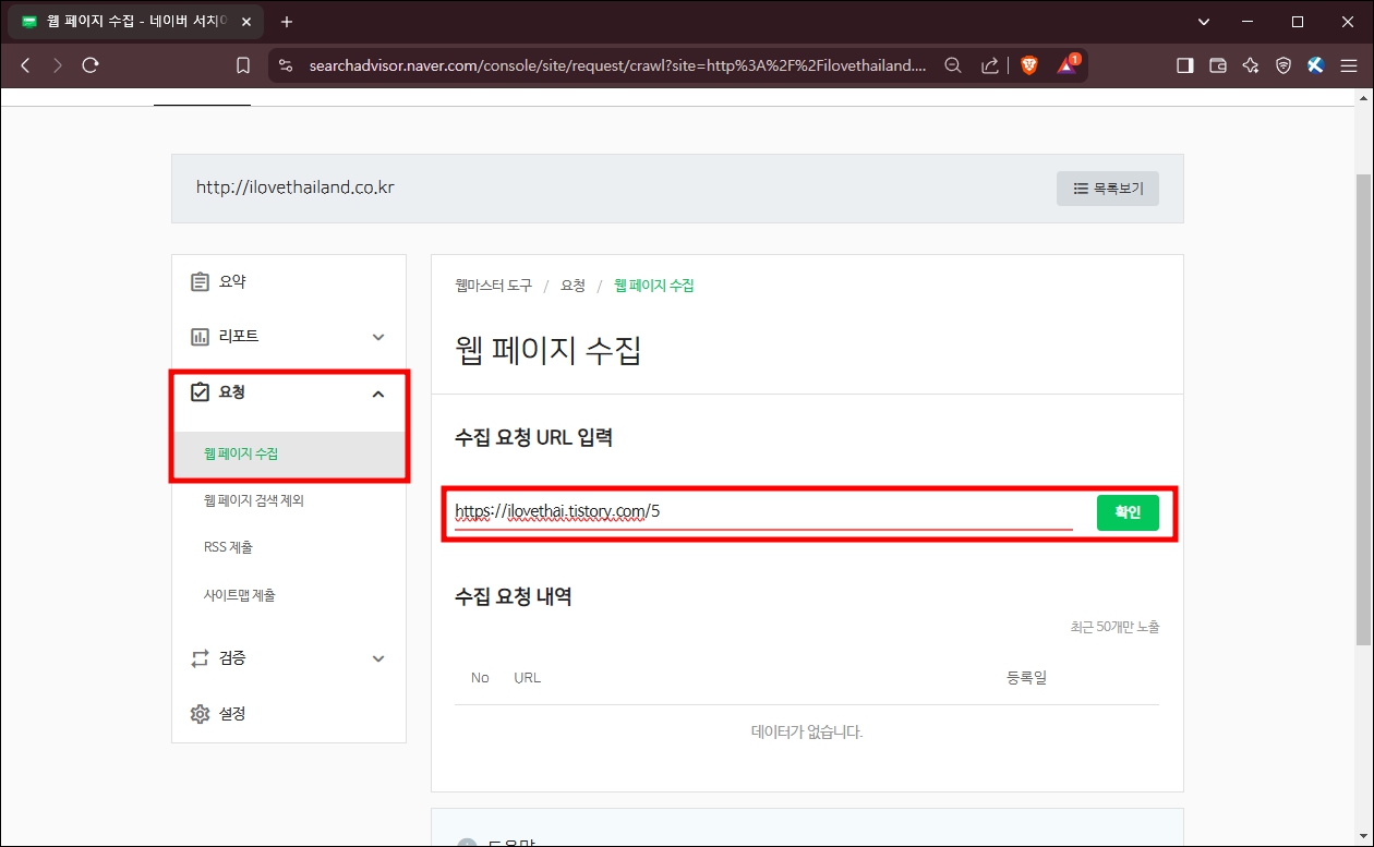 제가 쓴 글은, 5,6,7번 이기에 3개의 주소를 입력하니, 아래처럼 수집 요청 내역에 3개의 글이 올라가 있는 것을 보실 수 있습니다.