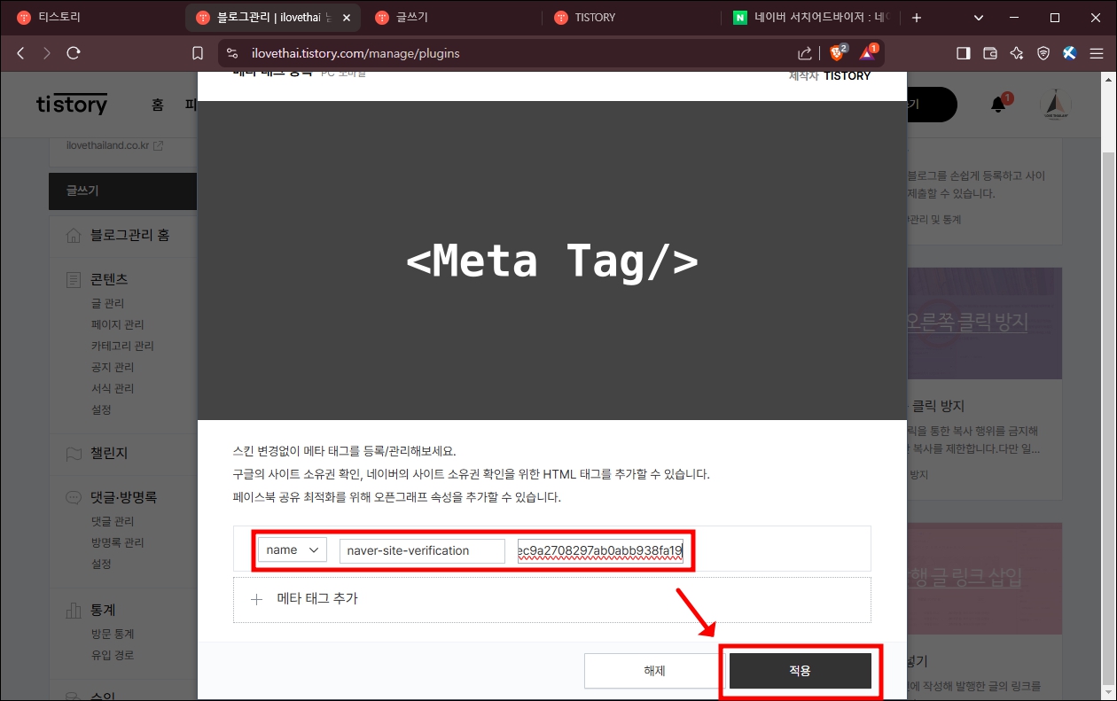 아래와 같이 나오면, 복사한 값 중, 가운데 칸에 네이버 사이트 베리피케이션을 넣고, 우측 칸에는 영문자와 숫자 값만 입력을 해주신 후에, 적용 버튼을 눌러 주세요.